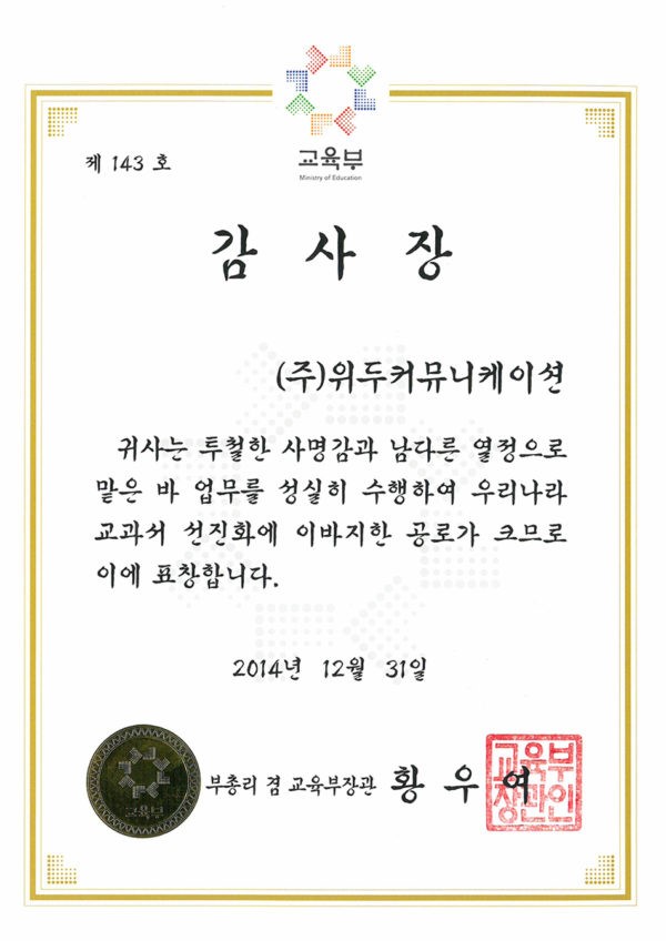감사장 제 143호 페이지 정보 작성자 WeDu 댓글 0건 조회 4,604회 작성일 19-05-30 19:33 본문 2014-12-31 감사장 제 143호 교과서 선진화 부총리 겸 교육부장관 황우여 List Previous산업통상자원부 표창장 19.05.30 Next한국여성벤처협회 표창장 19.05.30
