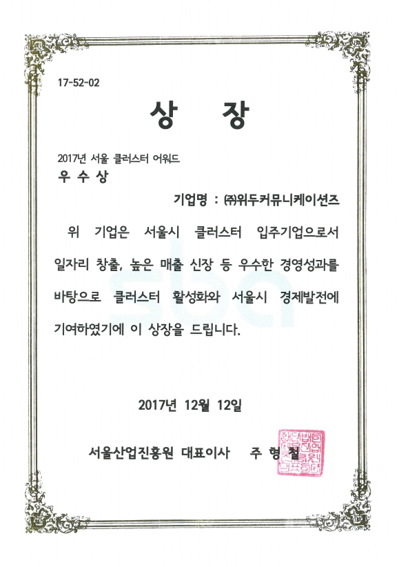 서울클러스터 어워드 우수상 페이지 정보 작성자 WeDu 댓글 0건 조회 5,613회 작성일 19-05-30 19:34 본문 2017-12-12 우수상 17-52-02 서울클러스터 어워드 서울산업진흥원 대표이사 주형철 List Previous서울특별시장 표창장 19.05.30 Next산업통상자원부 표창장 19.05.30