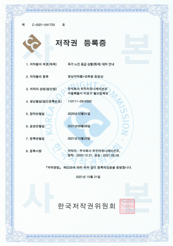 [한국/저작권] 독거 노인 응급 상황(화재) 대피 안내 페이지 정보 작성자 WeDu 댓글 0건 조회 4,838회 작성일 21-12-31 12:41 본문 2021-10-21 저작권 C-2021-041725 영상저작물>교육용 동영상 List Previous[한국/저작권] 장보기 인지훈련 게임 21.12.31 Next[한국/저작권] OLL KIDS/MATH 21.12.31